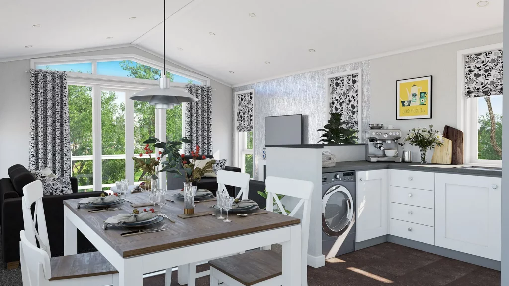 4-burner gas hob, oven, microwave, dishwasher, washing machine and fridge-freezer